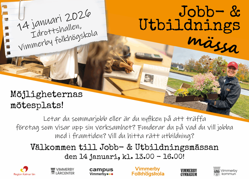 På Jobb- & Utbildningsmässa 14 januari 2026, kl. 13.00 – 16.00, i idrottshallen på Vimmerby folkhögskola, finns möjligheten!